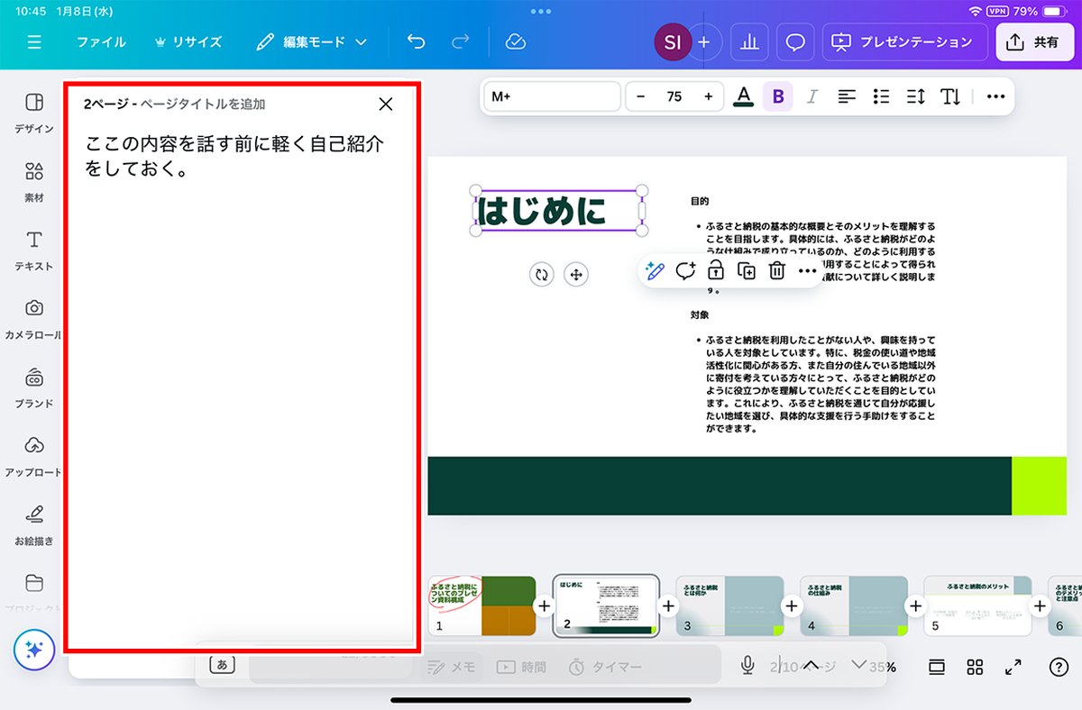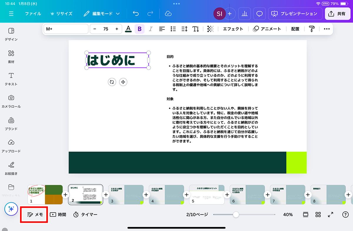 プレゼンの際に必須なのが、発表者ノート。「Canva」では「メモ」と呼ばれており、スライドごとに追加できる。メモを追加したいスライドを選択し、左下の「メモ」をタップするとメモの追加画面が表示されるので、プレゼンする際に必要な情報をまとめておこう。
