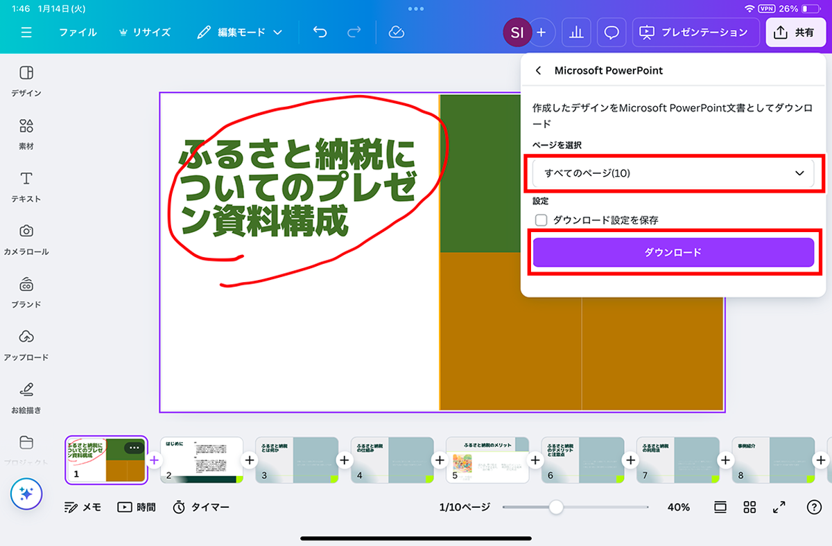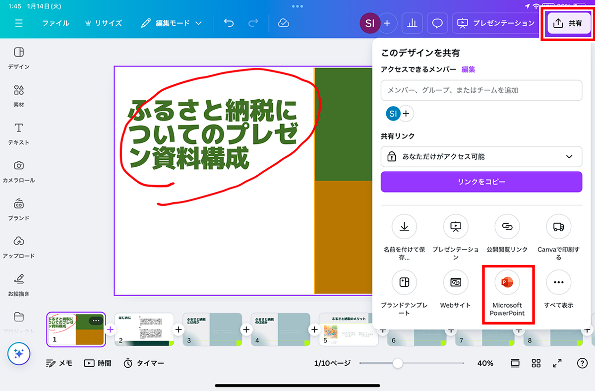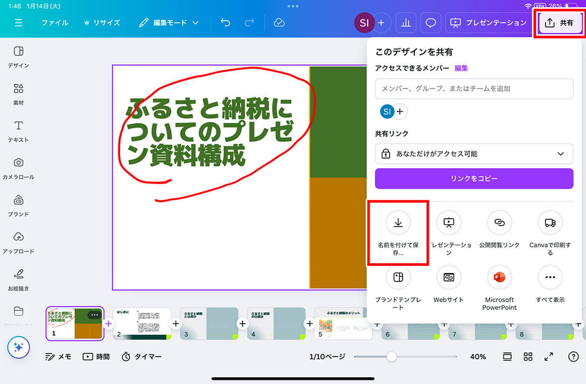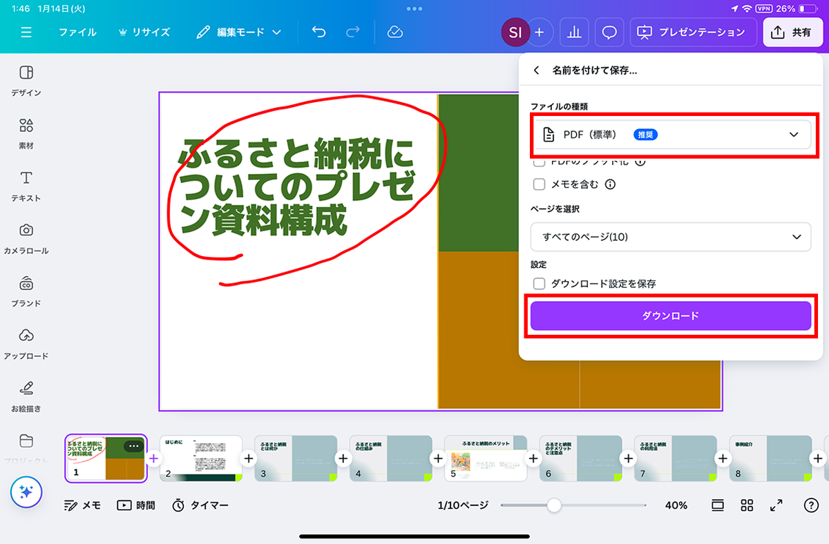 また、「Canva」はPDF形式で出力も可能。スライドを配布する場合は、「Canva」でPDF形式に保存しておくのがおすすめだ。