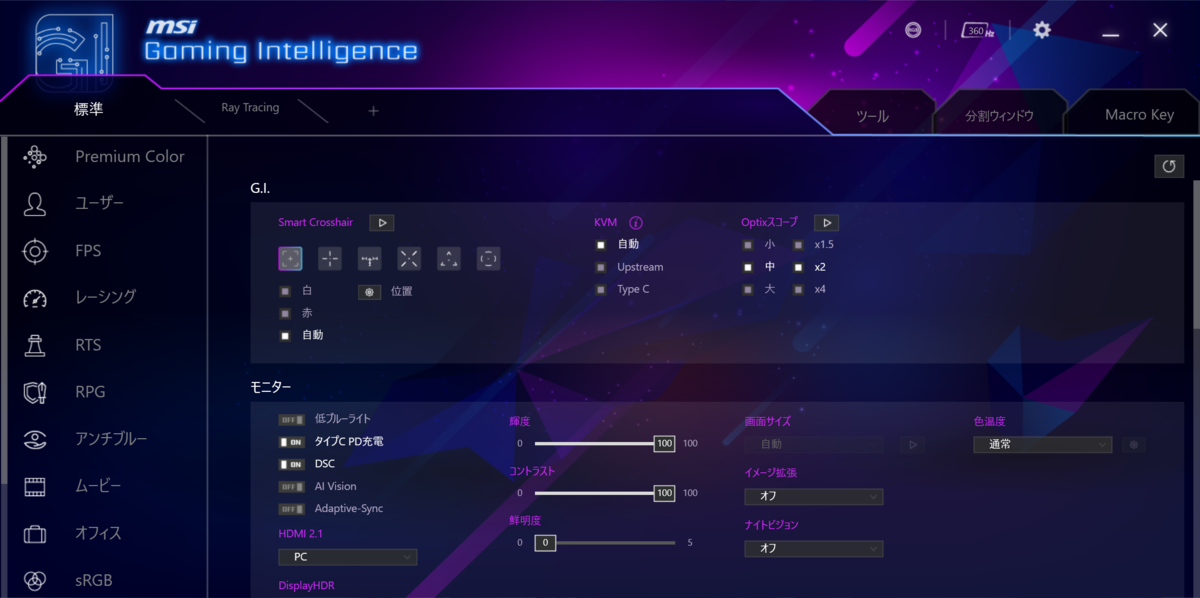 画面の切り替えは、スティックタイプのナビキーを操作することでできるが、「Gaming Intelligence」アプリを導入することで、パソコンの画面上から切り替えられる。OSDの画面で設定できることもGaming Intelligenceから行なえるので、キーボードとマウスだけで操作が完結する。