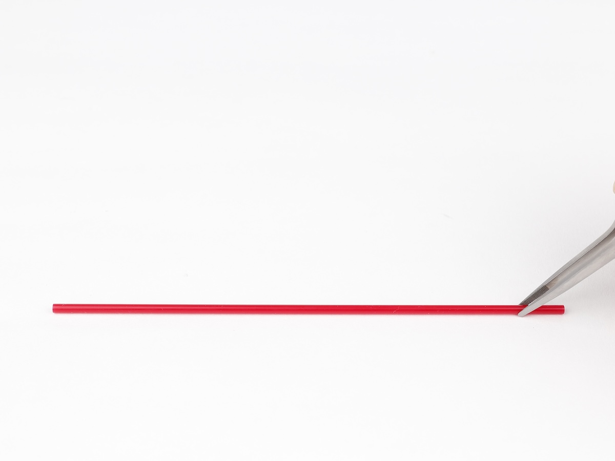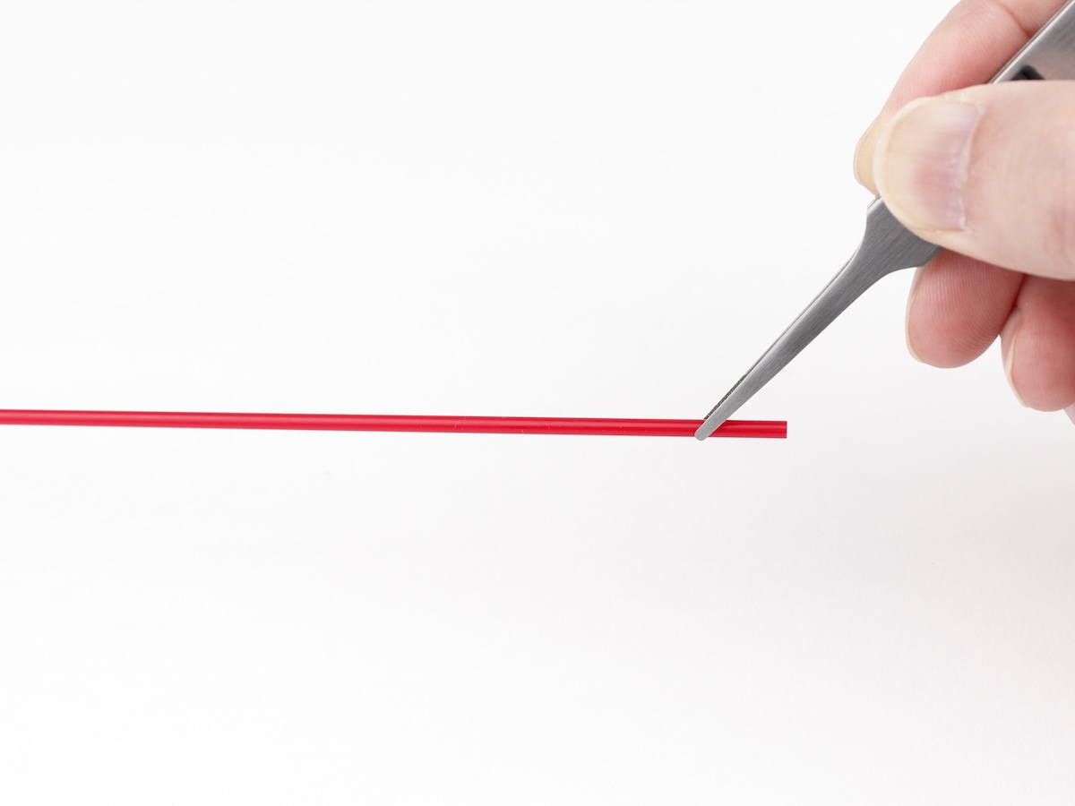 普通のピンセットとどう違うのか。約135mmのプラスチック棒を用意し、端から10mmあたりを斜めにつかんで持ち上げる、という簡単なテストで確認してみましょう。