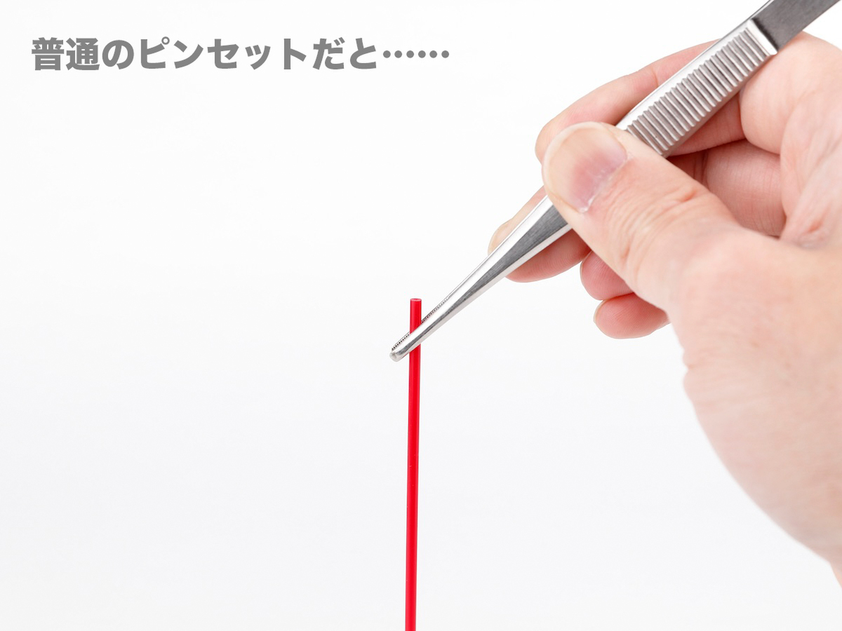 これだけ見ると、これといって不思議に感じない人が多いのではないでしょうか。それでは、横方向に溝の入った、普通のピンセットで同じように持ち上げてみると……