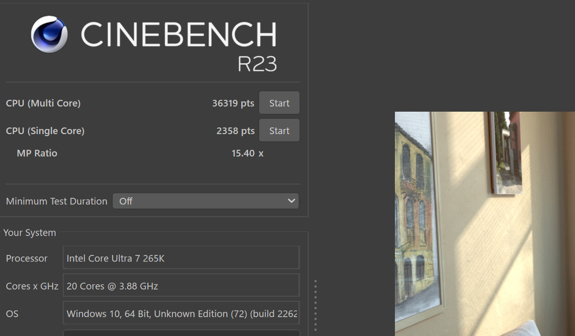 まずCINEBENCH R23。Multi Coreが36319pts、Single Coreが2358ptsといったスコアだった。インテル® Core™ Ultra プロセッサーではPコア側のHyper-Threadingサポートがなくなったとはいえ、Pコア8基、Eコア12基、計20スレッドのマルチスレッド性能があるのでMulti Core側スコアも十分に高い。その上でSingle Core性能も2000を超えているからキビキビ動く。
