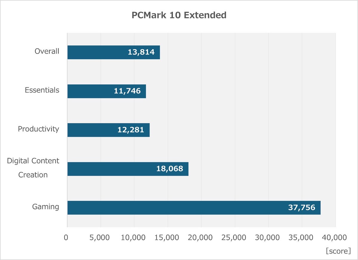 PCMark 10(Extended)でアプリケーション性能を見ると、ホーム用途のEssentialsが11746、ビジネス用途のProductivityが12281、コンテンツ制作Digital Content Creationが18068、そしてGamingが37756といった内訳でOverallは13814だった。ぶっちぎりでGamingスコアが高いのはもちろんGeForce RTX 4070 Ti SUPERだからとして、ほか3シナリオも10000を超える高スコア。なかでもDigital Content Creationが高いので、コンテンツ制作に興味のある方、クリエイターやコンテンツ制作を学びたい方にもオススメな構成だ。