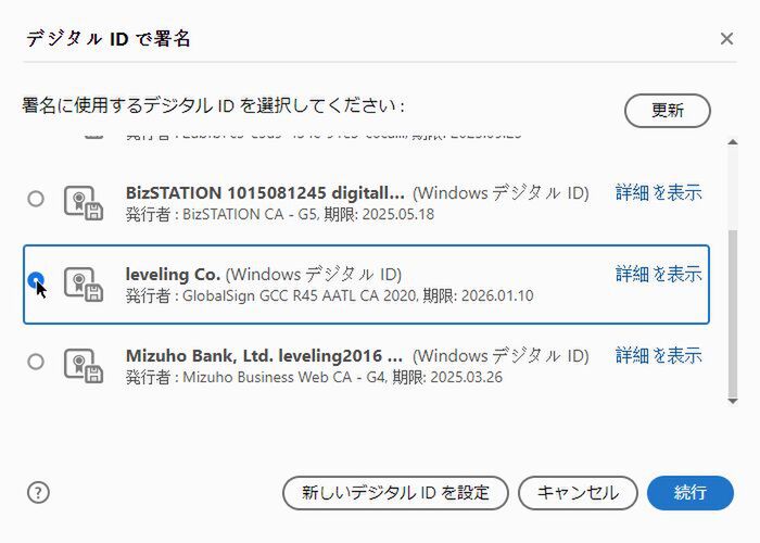 準備が完了したら、Acrobatで署名してみよう。「証明書を使用」を開き、「証明(不可視署名)」をクリック。最初は、確認画面が出るので「OK」をクリック。続いて、「デジタルID」の選択画面が開くので、自社名のIDを選択しよう。発行者は「GlobalSign」になっているはずだ。