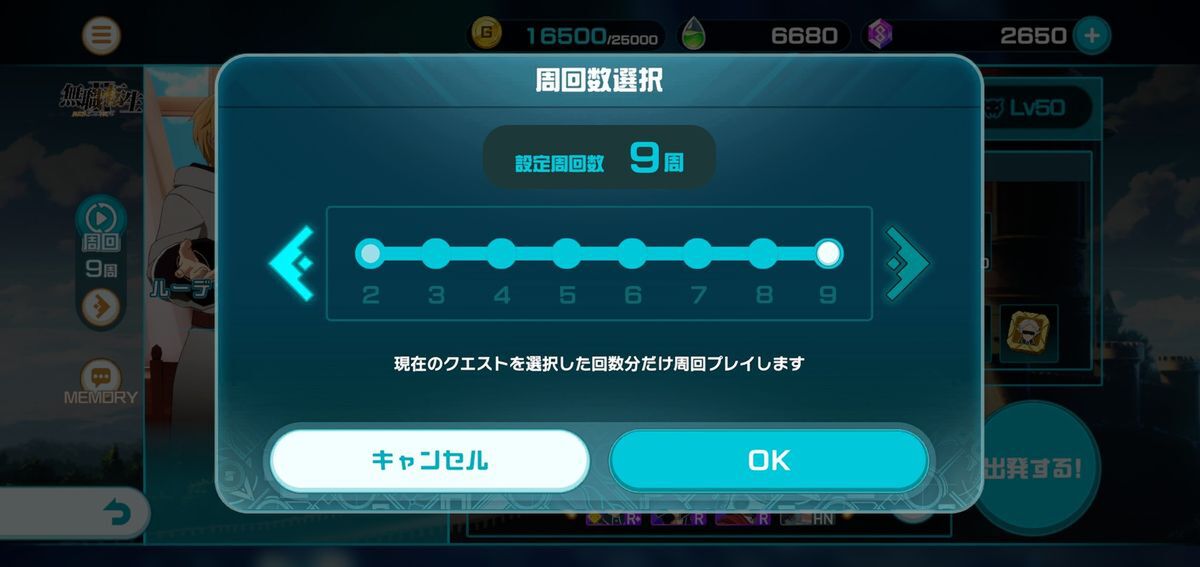 周回への配慮は感じられてGOOD。「周回」ボタンを押すと、同じクエストをフルオートで最大9回までプレイし続けてくれるのでラク。画質は最高設定にしているが、端末の熱さもそれほど気にならず、電池の消耗も少なそうなのは嬉しい。