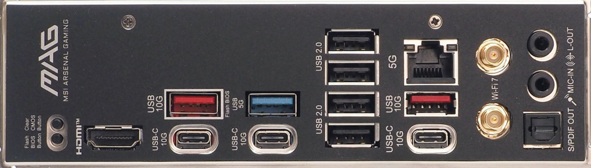 チップセット仕様としてAMD X870はUSB4を標準搭載とした一方、AMD B850にはその縛りがない。MAG B850 TOMAHAWK MAX WIFIも追加搭載はせずの方向性だ。そのため最速のUSBはフロント用20Gbpsになる。USB SSDの普及を見てもUSB4(40Gbps)についてはまだハイエンドユーザー向けという印象がまだ強い。多くのメインストリームユーザーにとって20Gbpsは将来使うだろう備えとして、今はまだ10Gbpsが本命という状況ではないだろうか。帯域を使うUSB4がない代わりに、増やされているのがUSB 10Gbps。ここは重宝するだろう。