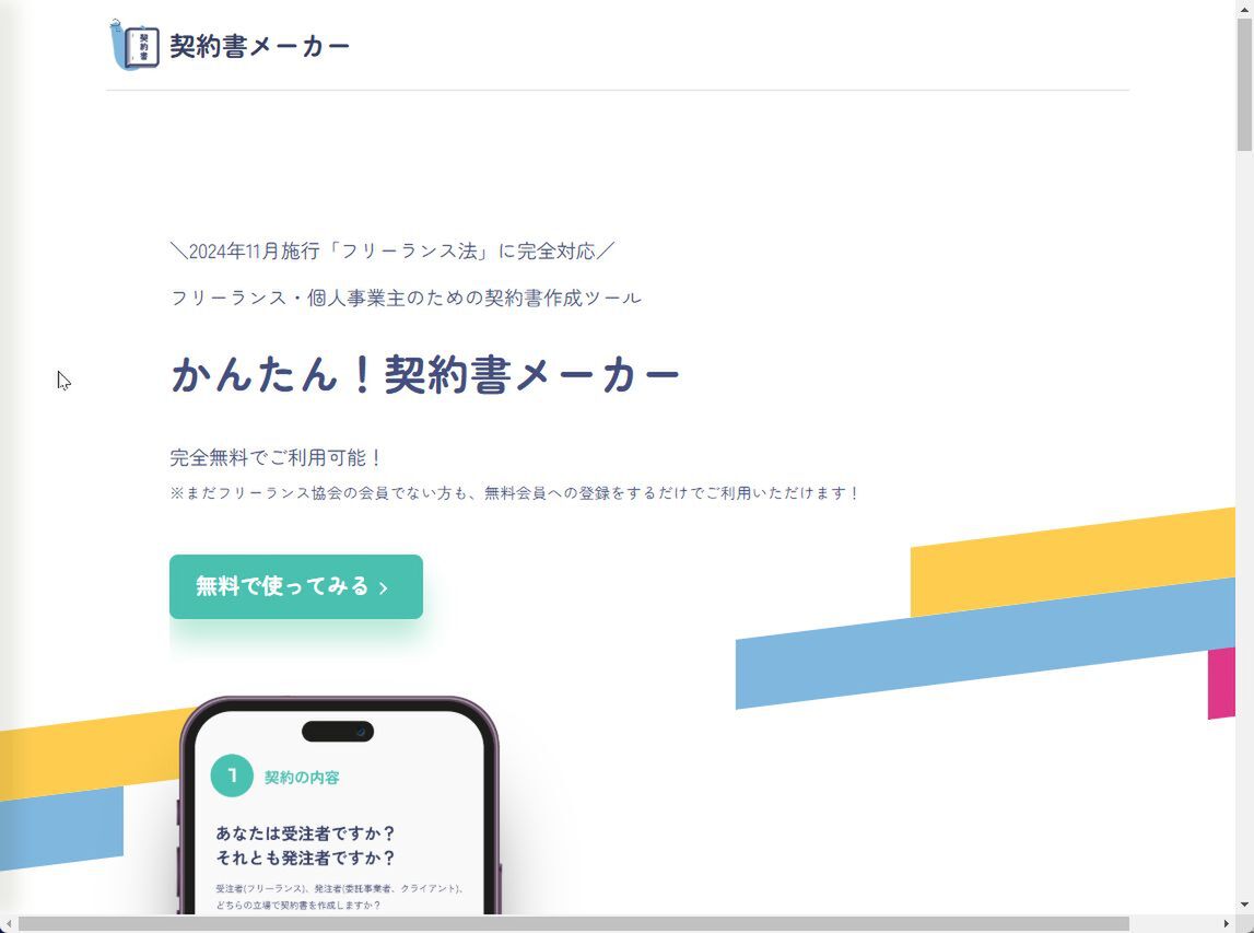 同じく、11月にはフリーランスや個人事業主として働く人々を支援するために設立されたフリーランス協会(正式名称:一般社団法人プロフェッショナル&パラレルキャリア・フリーランス協会)は、「契約書メーカー」の提供を開始した。幅広い職種の業務委託ケースに対応する契約書を無料で作れるサービスだ。「フリーランス・トラブル110番」で数多の契約トラブル相談に対応してきた第二東京弁護士会の担当弁護士らが監修しており、安心できる。