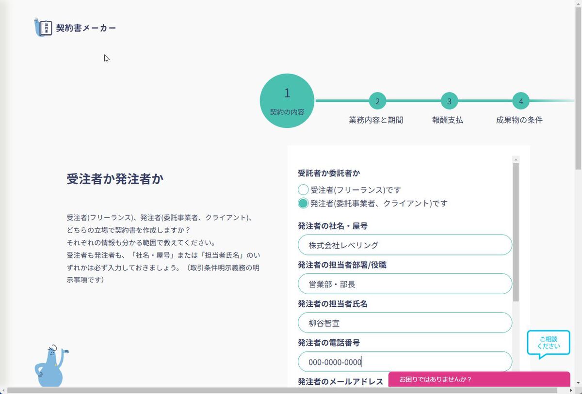 まずは、フリーランス協会のホームページから「契約書メーカー」を開く。受託者か委託者かを選択し、それぞれの情報を入力していく。左側にその解説もあるので、迷わず操作できる。大きく5ステップ用意され、それぞれの項目で複数の情報を入力する。簡単といっても、きちんとした契約書を作るので、入力する項目数は多い。しっかりと文章を読み、正確に入力していこう。