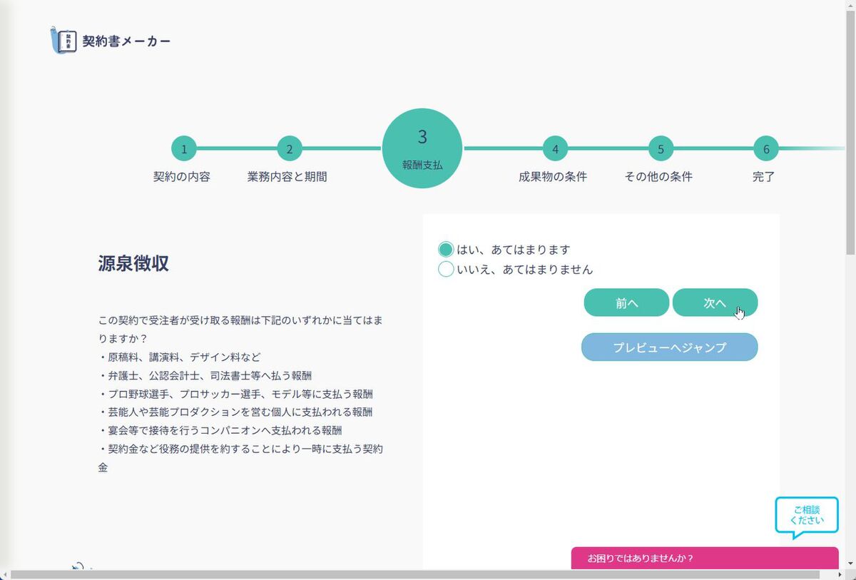 経費や振込手数料、源泉徴収などについても、契約書できっちり決めておくことで後のトラブルを回避できる。もちろん、それぞれの項目を入力するページが用意されているので、ユーザーは回答していくだけでOK。