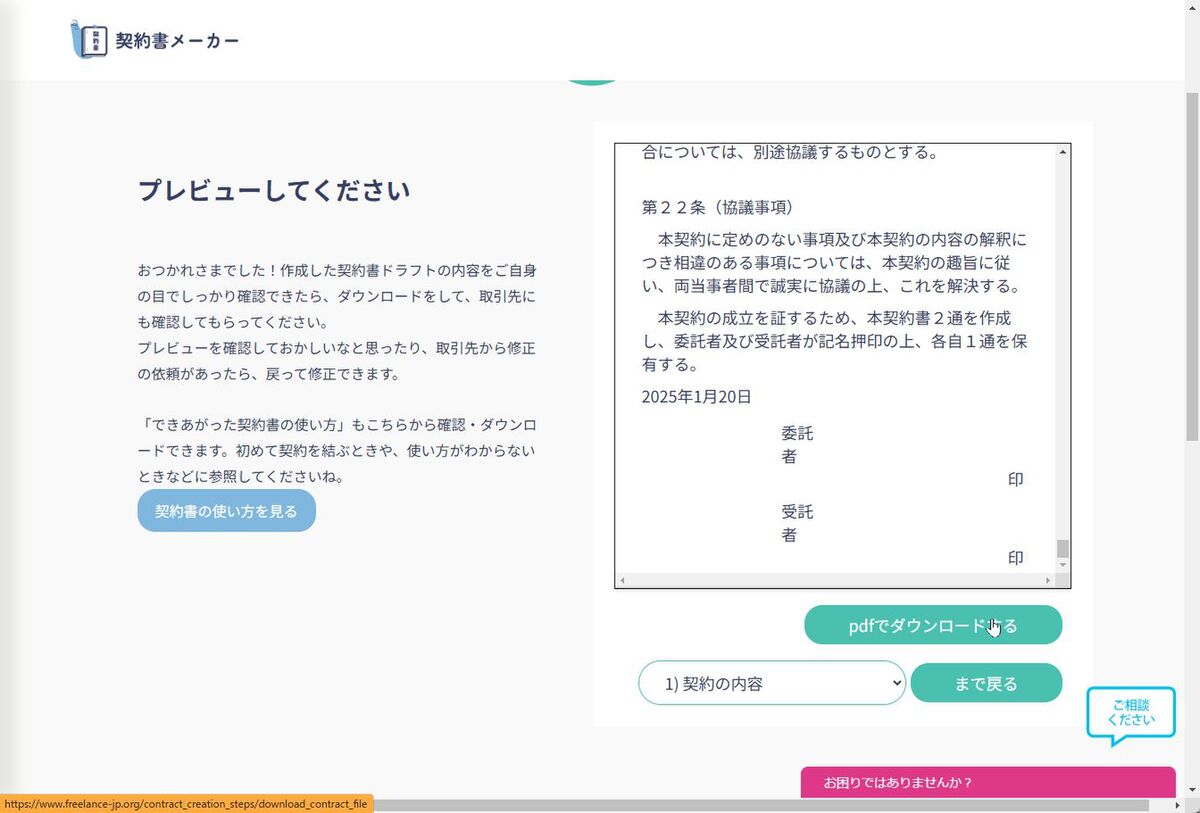 すべての項目を入力し終わったら、プレビューする。確認画面からは任意のところまで戻って再作業することも可能だ。問題なさそうなら、「PDFでダウンロードする」をクリックして契約書のファイルをダウンロードしよう。
