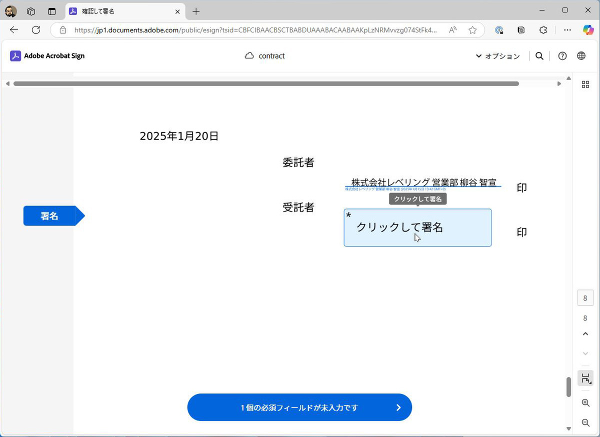 まずは、自分で署名し、「送信」をクリック。相手にも電子サインの依頼メールが送られているので、署名してもらう。受託者はAcrobatを持っていなくても、ブラウザ上でサインできる。Adobe IDを持っていなくてもいい。