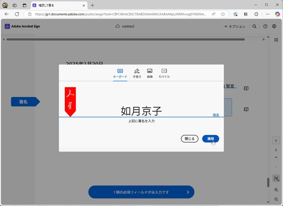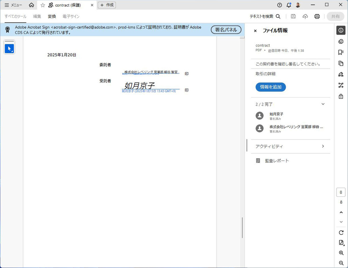 署名と言っても手書きしてもいいし、キーボードでタイピングしてもいい。どちらでも法的効力を持っているので安心しよう。先方が署名すれば電子サインの処理が完了。PDFには署名パネルが表示され、何時何分に誰が署名したのかなどを確認できる。あとは、このPDFファイルをきちんと保管しておけばいい。