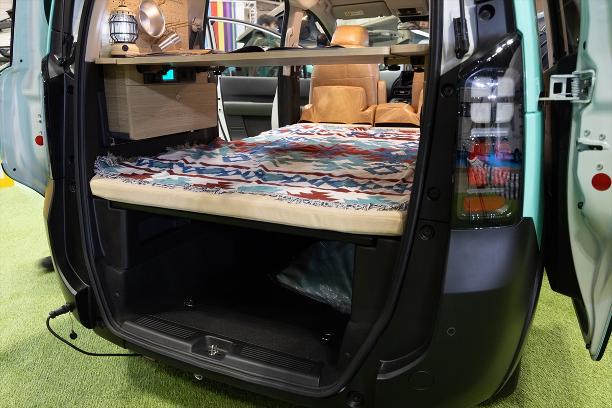 ダイハツの「アトレー RS」がベースのRS1XX(展示車価格385万7900円)は、ベッドマットにこだわった1台。同社の高級ハイエースキャンピングカー RSプレミアムと同等なのだそう。