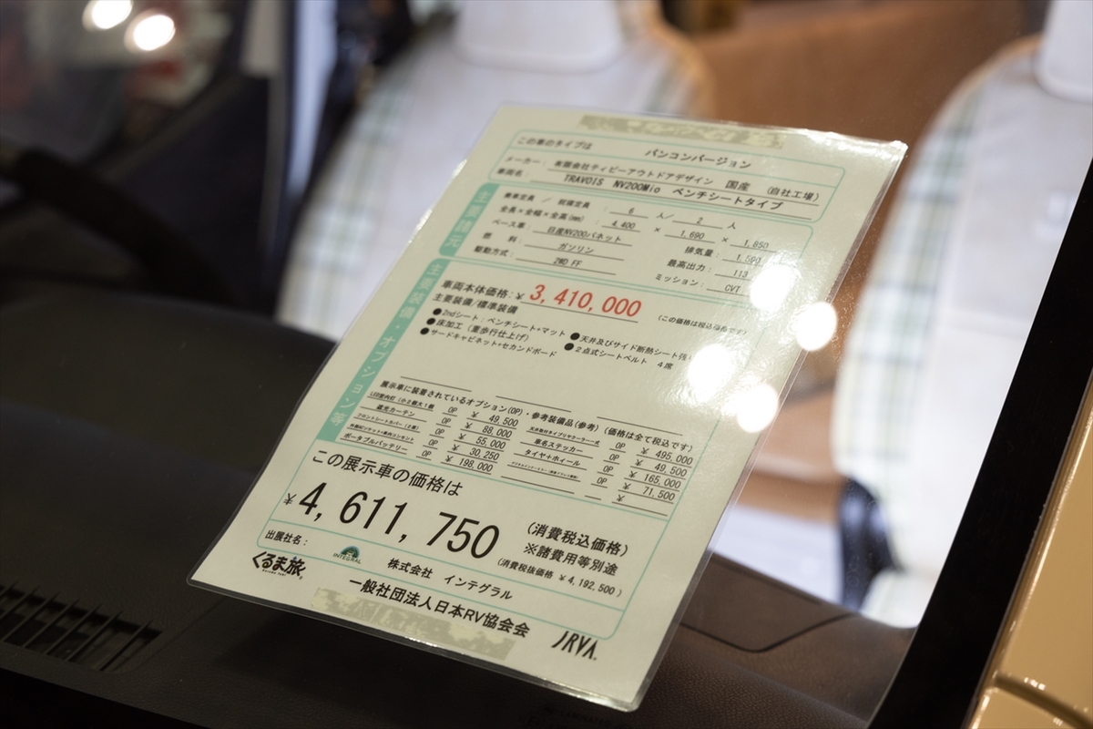 再びNV200ベースのキャンピングカーを発見。こちらはインテグラルという埼玉県の会社が架装したクルマで、展示車価格は461万1750円。MYROOMと似た室内のAタイプと、ベンチシートタイプのBタイプを用意しています。