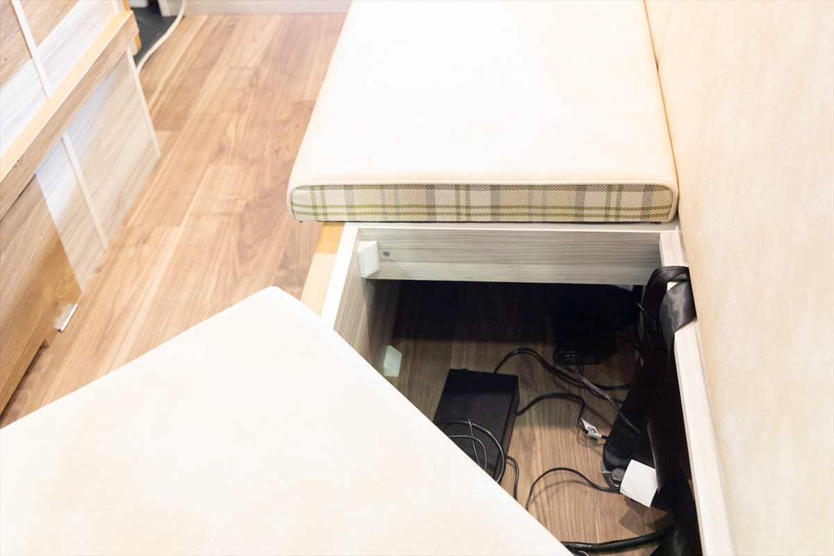 ベッドマットの下は、薄型ではあるものの収納スペースがあるほか、フリップダウンモニターがありますから後席で動画鑑賞ができます。写真には写っていませんが、トノボード(テーブル)を取り付けることができるようです。