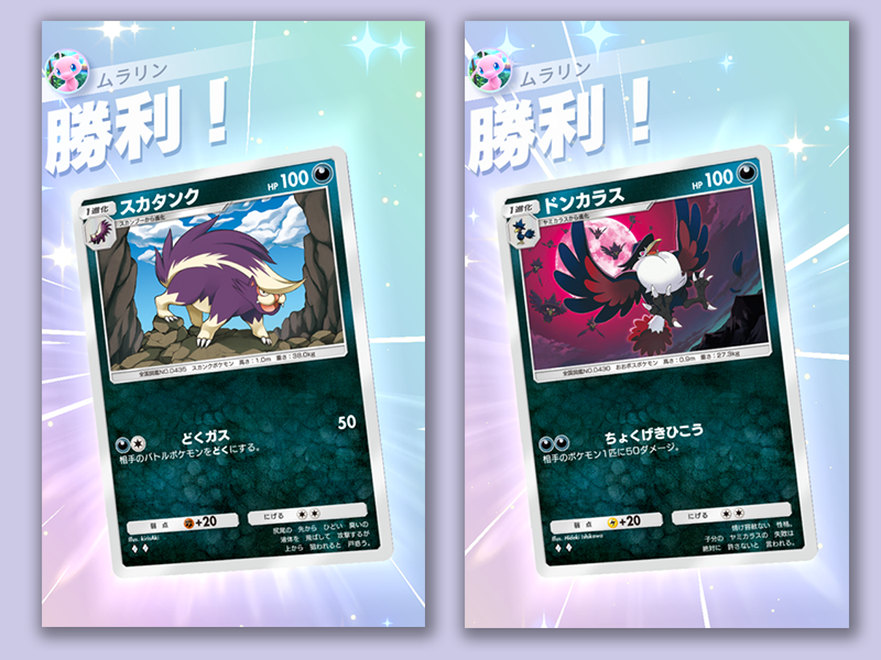 本デッキのメインアタッカー。イベントに登場するポケモンは超タイプですので、悪タイプが弱点属性になります。攻撃はすべて+20ダメージになるので、1発で70ダメージ入れられます。加えて、スカタンクの攻撃には毒が付与されるので、攻撃後に+10ダメージで、計80ダメージ。相手の攻撃後にも10ダメージ入るので、1撃90ダメージの攻撃になります。