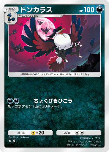 相棒は、こちらも2エネで50ダメージ、超タイプ相手になら70ダメージを出せるドンカラス。毒攻撃はない代わりに、バトル場のポケモンでもベンチのポケモンでもどちらでもターゲットにできるのが強みです。アカギ同様、ベンチに下がった瀕死のポケモンの追撃にも使えます。