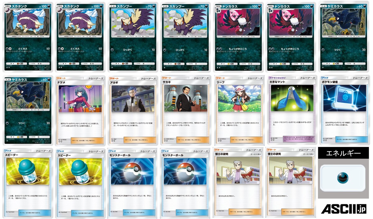 こちらのデッキですが、メインアタッカーのスカタンクがいい仕事をしてくれます。相棒には、攻撃する相手をバトル場、ベンチのどちらからも選べるドンカラスを採用しています。