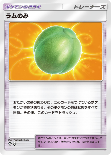 このほか、候補となるのはポケモンのどうぐの「ラムのみ」です。エキスパート戦に出てくるムウマージexは、攻撃に「こんらん」が付与されているので、これを回避するために次のターンにムウマージexの攻撃を受けそうだというときに持たせておくといいかもしれません。ラウのみを入れるのであれば、大きなマントの代わりにといった感じでしょうか。