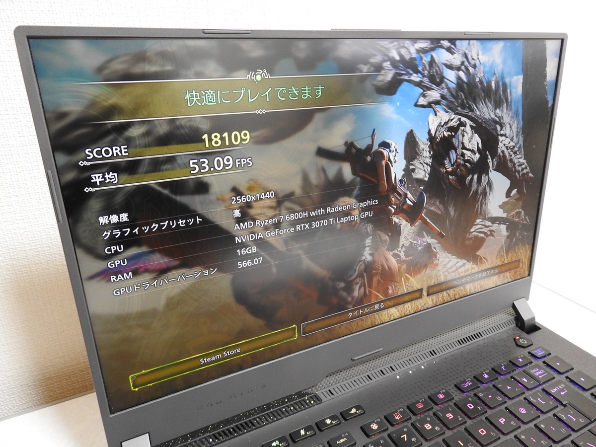 もう一台のゲーミングノートPC(GPUはRTX 3070)で測定したところ、スコア18166「快適にプレイできます」をマーク。いろいろと試してみたが、結局デフォルトの設定がバランスよくて個人的にはよさそうだと思った。