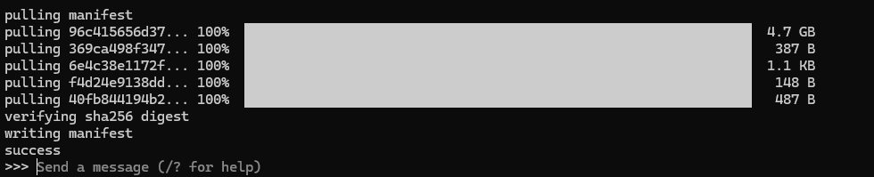 ダウンロードが始まる。なかなか終わらないので心配してしまうかもしれないが、4.7GBもあるので気長に待とう。「Send a message (/? for help)」と表示されればR1のインストールは終了だ。