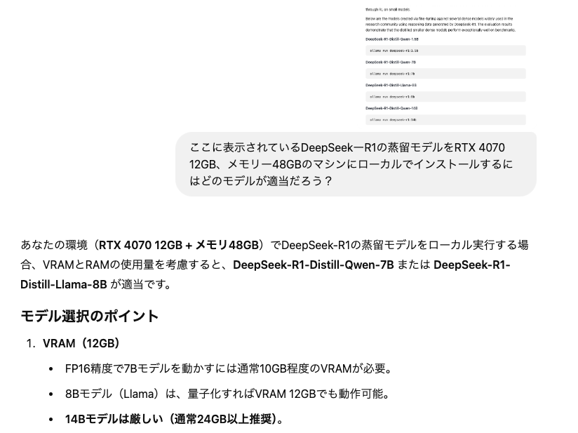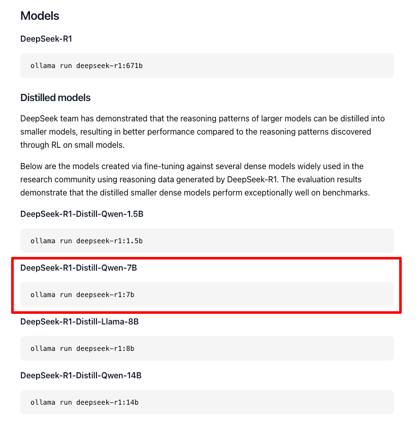 DeepSeek-R1のベースモデルはおよそ1.3TBの巨大なファイルだが、普通のPCで動かすのは不可能なため、多数用意されている蒸留(Distilled)モデルを利用することにする。今回は70億パラメーターの「DeepSeek-R1-Distill-Qwen-7B」を使用するが、ollamaではこれがさらに量子化(モデルの精度を少し下げてサイズを小さくする技術)され、4GB程度まで軽量化された状態で実行される。