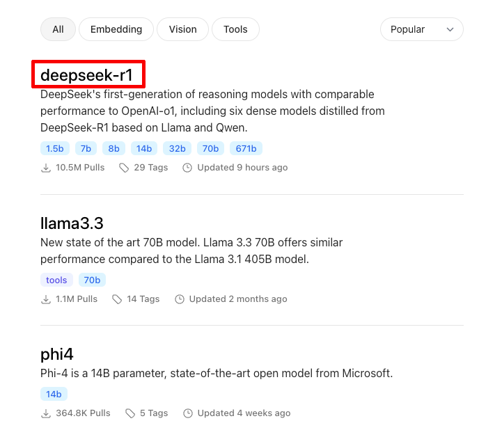 次にインストールするモデルの選択だ。WebブラウザーでOllamaのModelsページを開くと、利用できるモデルが一覧表示される。今回は「deepseek-r1」を選択する。