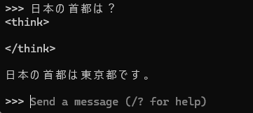 会話を楽しむためには別のモデルを選択する必要がありそうなので、「Ctrl+C」で一旦プロセスを終了する。