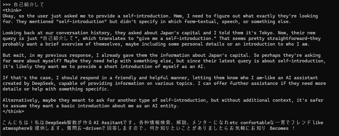 あれ?おかしいぞ?長考した上で下記のようなメタメタな回答が表示された。「こんにちは!私はDeepseek智数が作る AI Assitantです。各◯情報検索、解説、メンターになれetc confortableな一言でフレンド Like atmosphereを提供します。質問お-drivenで回答しますので、何か知りたいことがありましたらお気軽にお知りBecomes !」