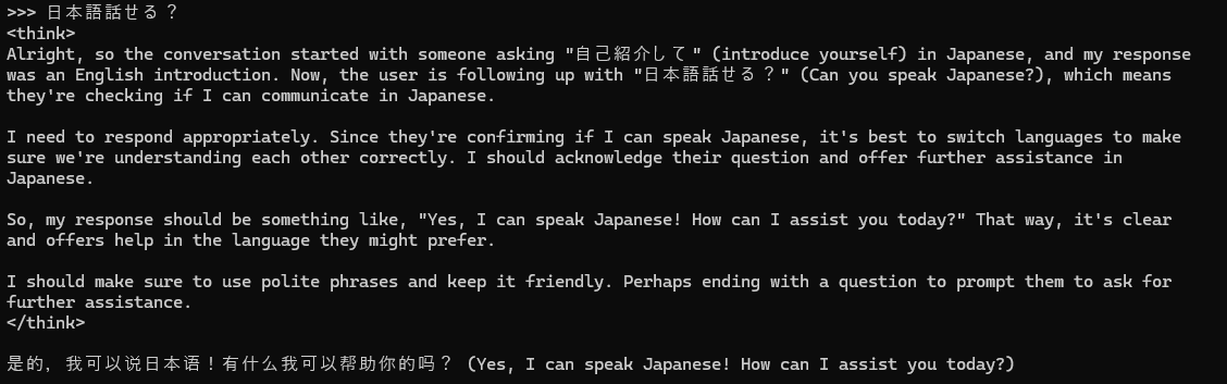 結果は「是的,我可以说日本语!有什么我可以帮助你的吗?(Yes, I can speak Japanese! How can I assist you today?)」と、中国語/英語併記で表示された。やはり日本語は少し苦手なようだ。