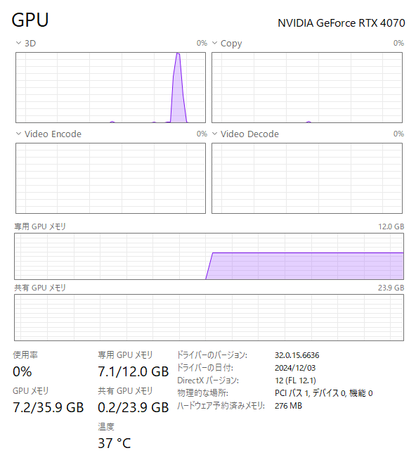 なお、タスクマネージャーを見てみると、推論開始時にGPUの「3D」計算量が一時的にほぼ100%に跳ね上がるものの、グラフィックメモリーの利用率は「7.1/12.0GB」に留まっている。温度も37度でファンも回らなかった。