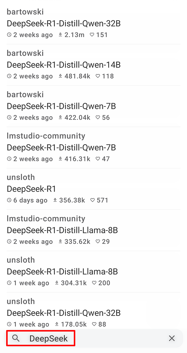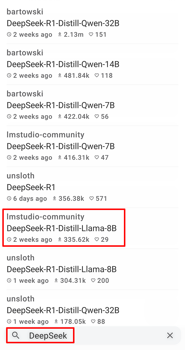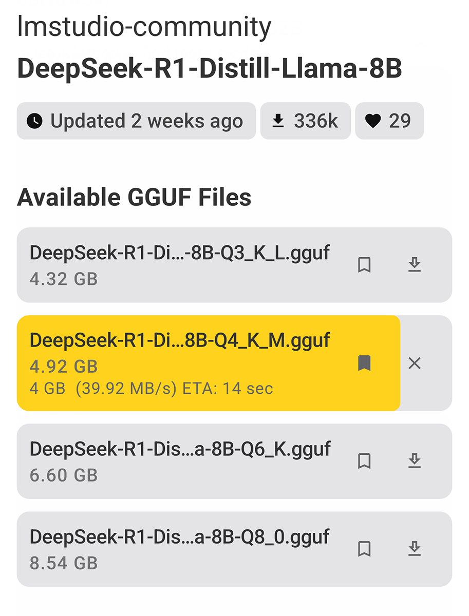 これまでのollamaやLM Studioでは自動的に4ビット(Q4)モデルが選択されていたが、PocketPal AIではまだDeepSeekがデフォルトモデルとして登録されていないため、Hugging Faceから直接ダウンロードすることになる。