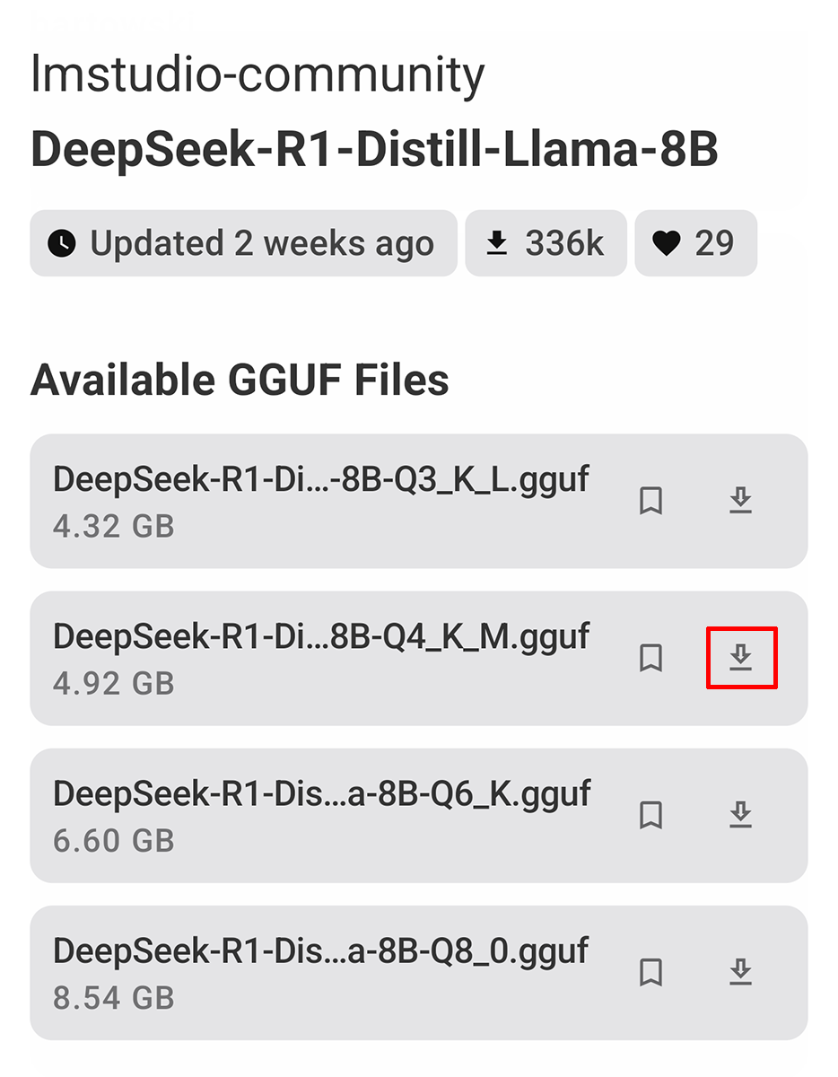 ここではollamaやLM Studioと同じようにQ4モデルを選択し、「↓」をタップしてダウンロードしよう。