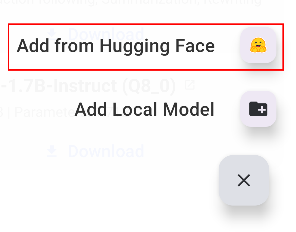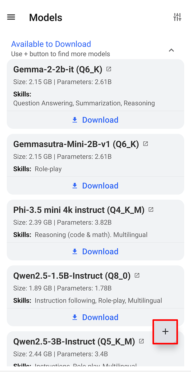 アプリで使えるモデルのリストが表示される。ollamaやLM Studioと違い、DeepSeekのモデルはまだ登録されていなかったため、右下の「+」をタップ、「Add From Hugging Face」をタップしよう。