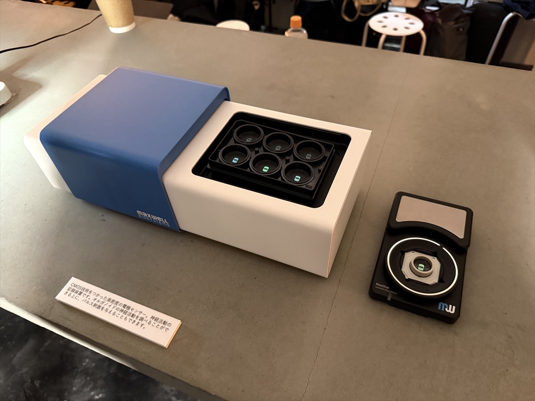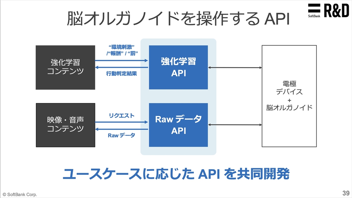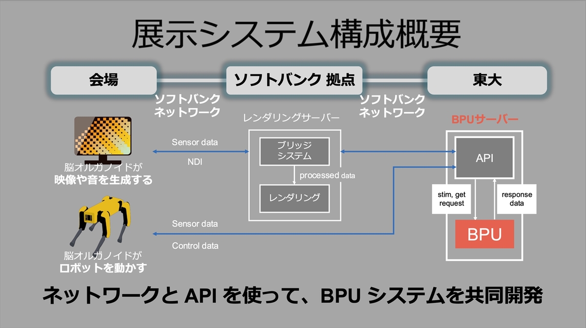 今回の展示は東京都内の某所で行なわれた。脳オルガノイドは東京大学の研究室にあり、ソフトバンクが開発したAPIを用いて脳オルガノイドに対して電気信号を入出力し、会場からソフトバンクのネットワークを介して脳オルガノイドにアクセスする仕組みになっていた。