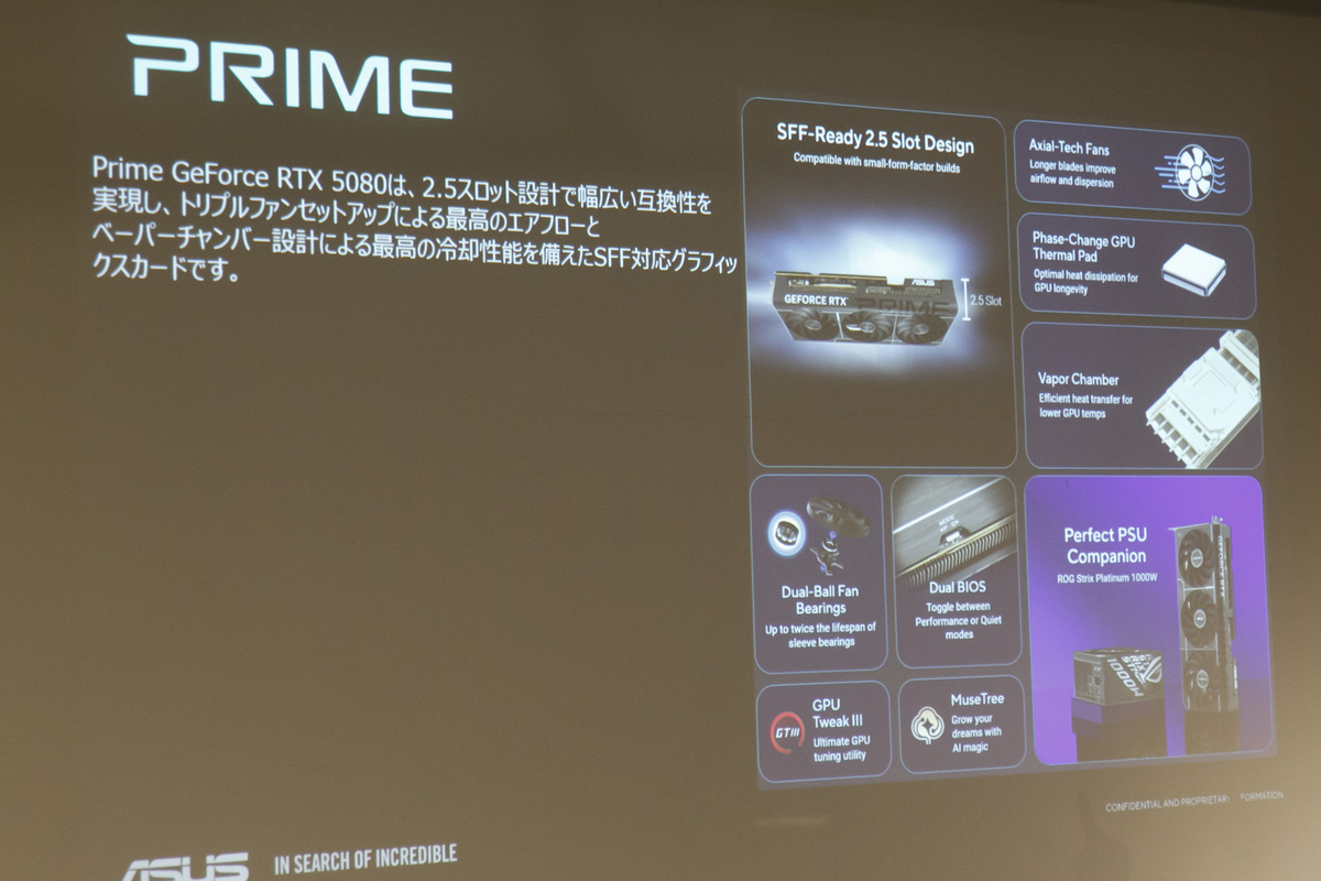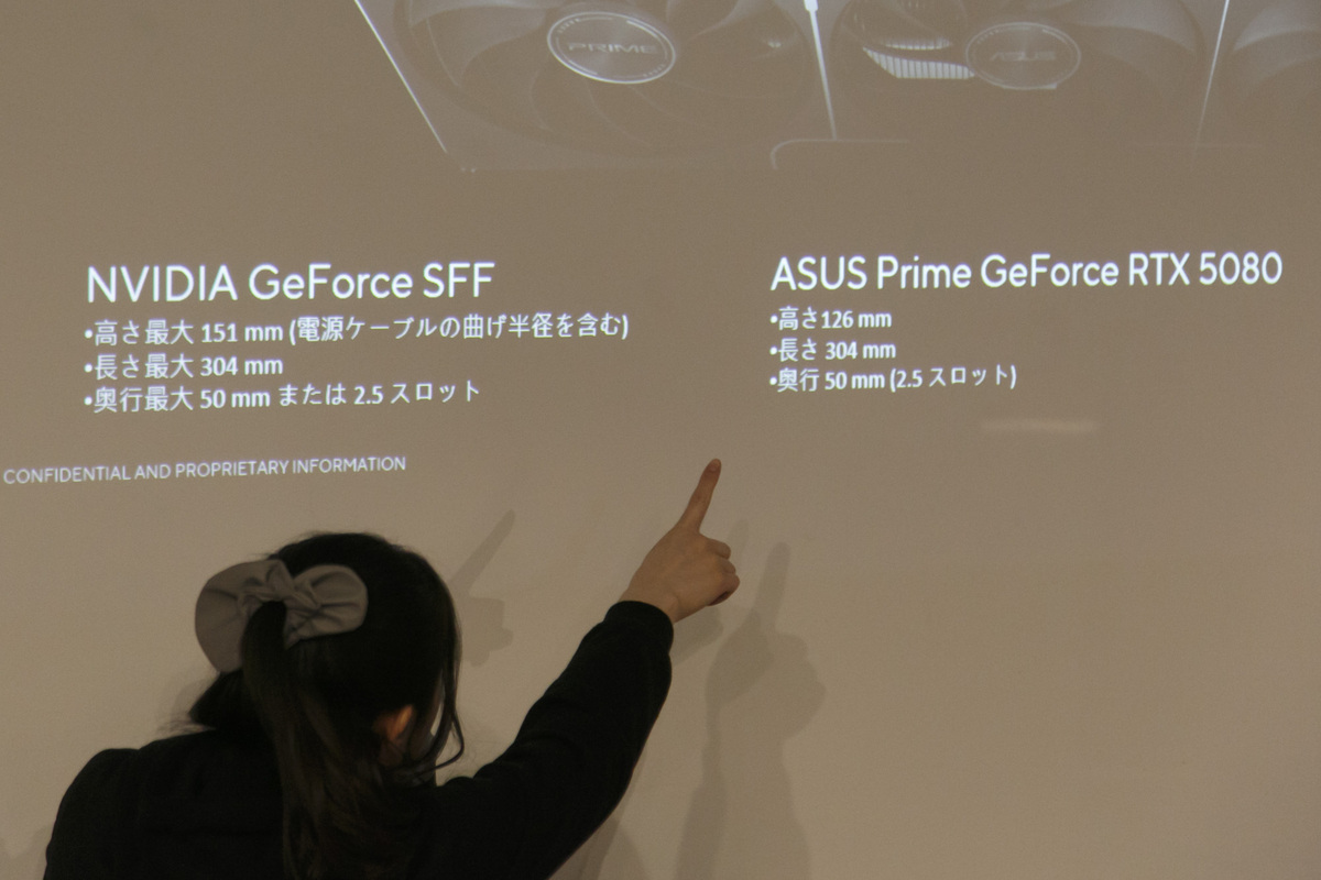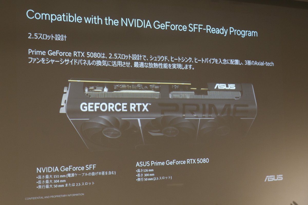 続いてジョージさんが「個人的に超ダークホース」と紹介したのが、「ASUS Prime GeForce RTX 5080」。その理由は、グラボがNvidia GeForce SFF-Ready準拠で設計されているところ。“SFF”とは“Small form factor”の略で、ある程度小さなサイズのPCケースにも収納できる規格。ASUS Prime GeForce RTX 5080の本体サイズは、Nvidiaが提唱するSFFのサイズとぴったり同じ。