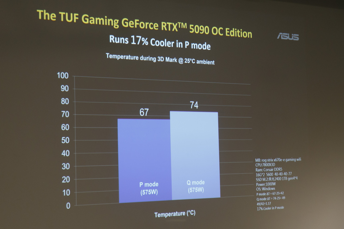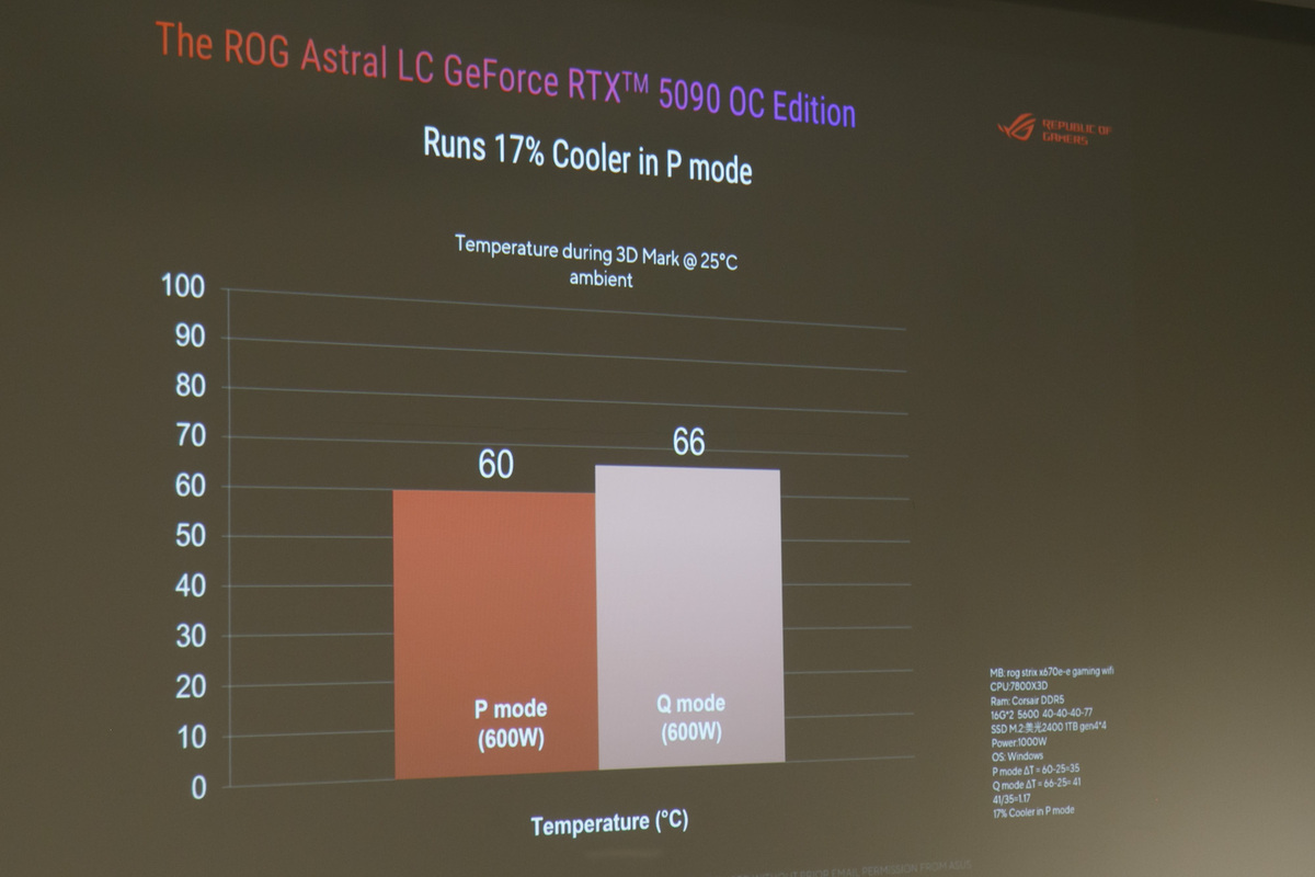 このなかで注目すべきは、簡易水冷ユニットを搭載した「ROG Astral LC GeForce RTX 5090」だ。なんとPモードでも60~66度程度までしか上がらないそうだ。計測結果のグラフを見ながらジョージさんは、「RTX 5090は高温になると思われがちだが、冷却性能が高いのでそれほど熱くならない」と語った。
