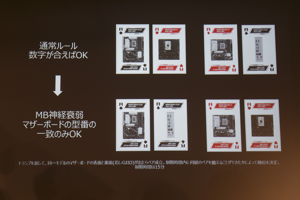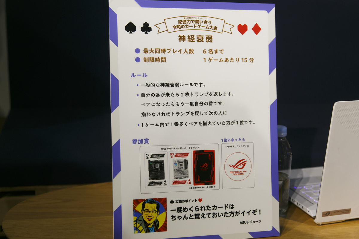 イベントの最後のセッションは、来場者参加型企画の“神経衰弱”が行なわれた。しかし、これはよくある神経衰弱ではなく、今日のイベントのためにASUS・ジョージさんが作ってきたオリジナルトランプを使って競い合う神経衰弱。