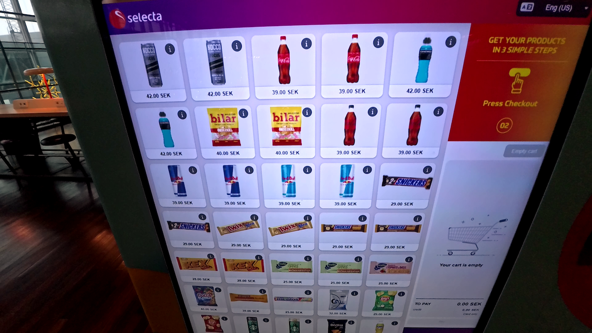 幸い国際線出発ゲートのエリアも電源付きのテーブルはあり、Wi-Fiも爆速なので時間は潰すことができます。ただ、軽食でも買おうかと自販機をみてみると、コーラが1本39SEK(約541円)、スニッカーズが1個29SEK(約402円)と高い! 結局、機内食まで我慢することにしました。