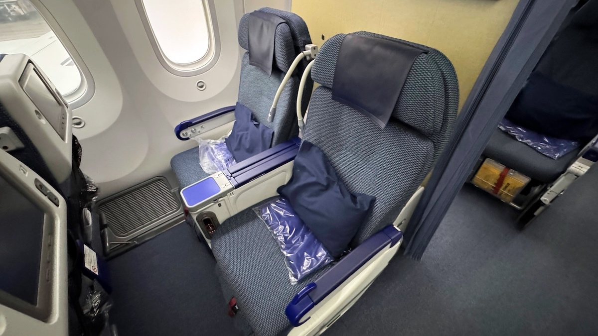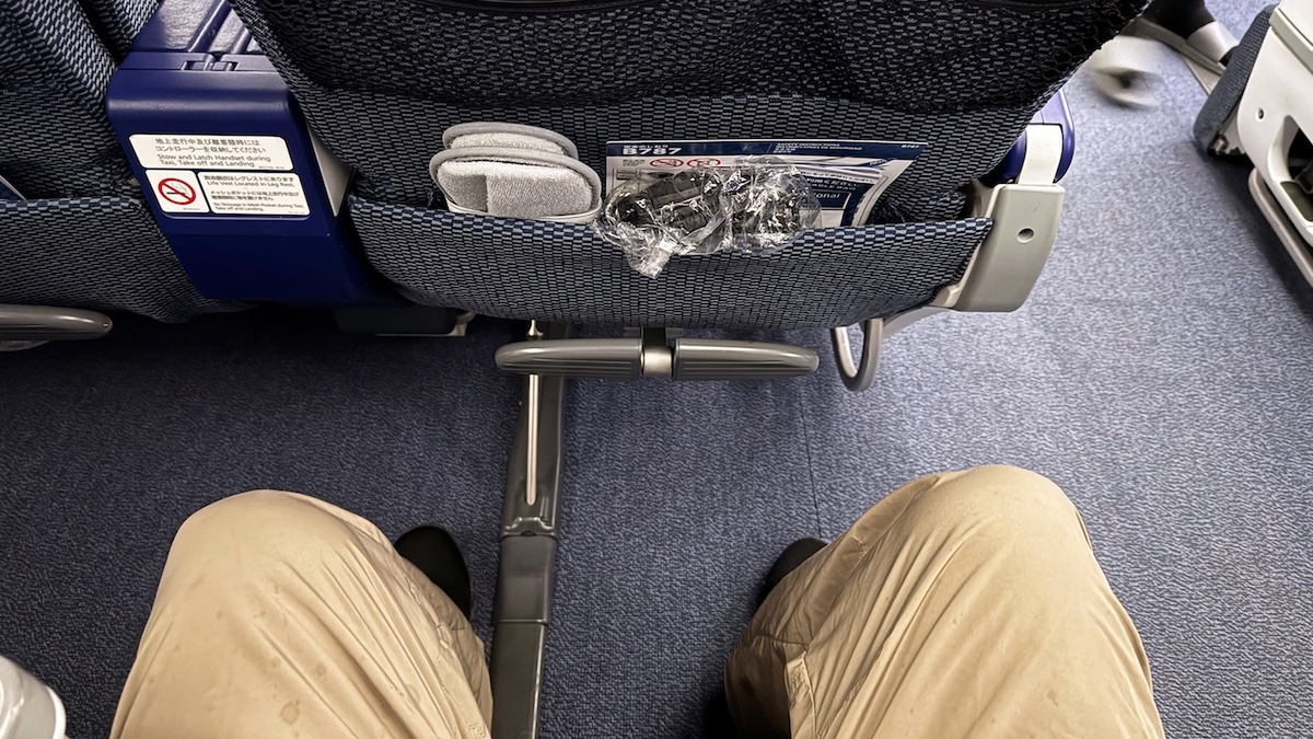 復路のNH222便は、ほぼ時間通りに搭乗を開始し、出発も6分遅れ程度のオンタイム。座席はプレミアムエコノミーということで、往路よりシートの幅もシートピットも広く、レッグレストもあって快適です。