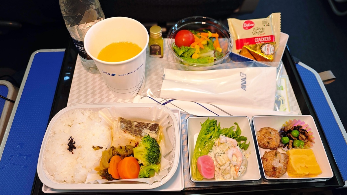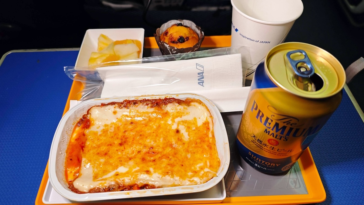 機内食はエコノミークラスと同じですが、1食目は「白身魚西京焼き」か「ビーフシチュー マッシュポテト添え」からの選択で、2食目は「鶏肉の香味あん掛け」か「ビーフラザニア」から選択できました。