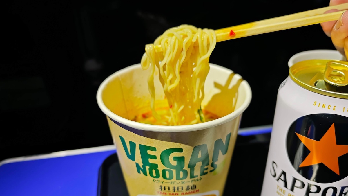 また、プレミアムエコノミーは軽食にT’sレストラン監修の「ヴィーガンヌードル担担麺」がオーダーできます。しかもビジネスクラスのドリンクも頼めるとのことで、嬉しくてビールに加えてシャンパンもお願いしちゃいました。