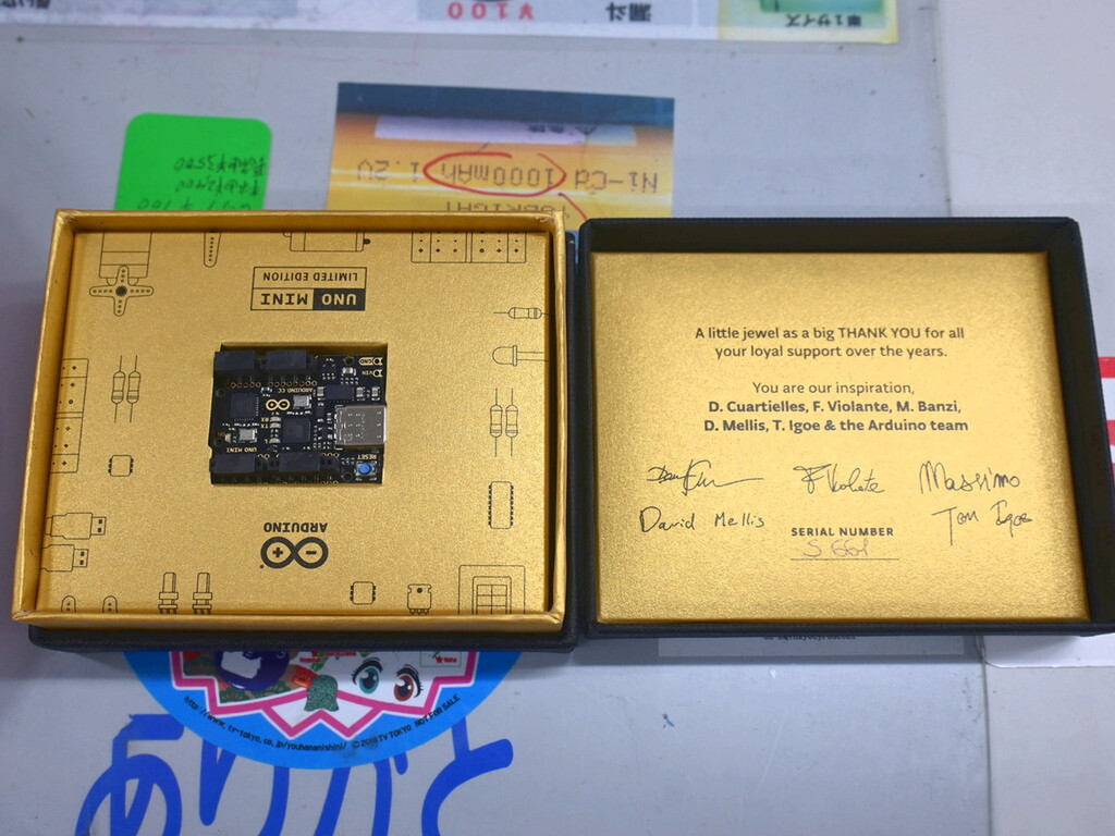 Arduino Unoを小型化した限定バージョンで、基板にはシリアルナンバーをプリント。ブラックとゴールドを基調とした特別なパッケージには開発者のサインも入っている。