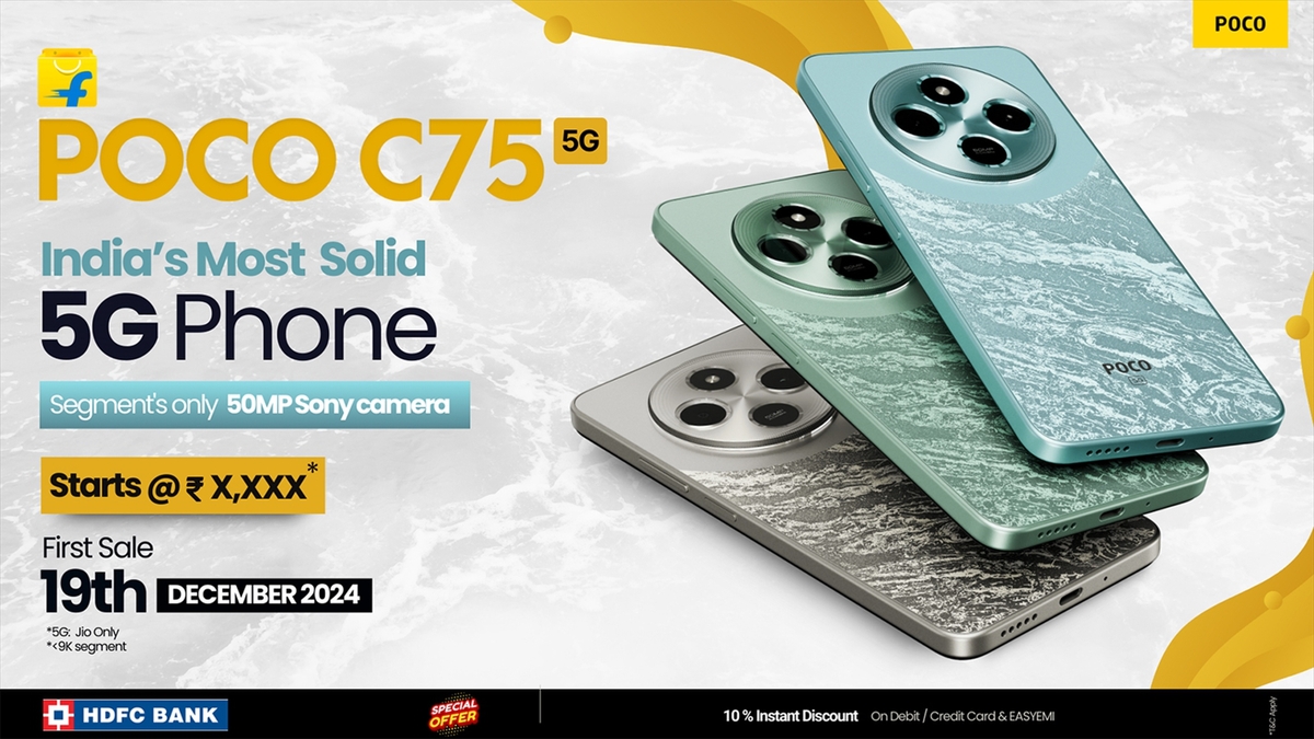 そして、エントリーのCシリーズからは「POCO C75 5G」もインドで発売されています。この特徴的なカメラバンプデザイン、日本でも販売中の「Redmi 14C」によく似ていますが、その5Gモデルと言える存在です。6.8型ディスプレーと5160mAhバッテリーは同じですが、チップセットはSnapdragon 4 Gen 2、カメラは5000万画素が1つとなっています。背面仕上げはRedmiとは異なり、ちょっと派手めです。価格はメモリー構成が4GB+64GBで7999ルピー(約1万4000円)、カメラは1眼ながら5Gモデルとしては格安です。