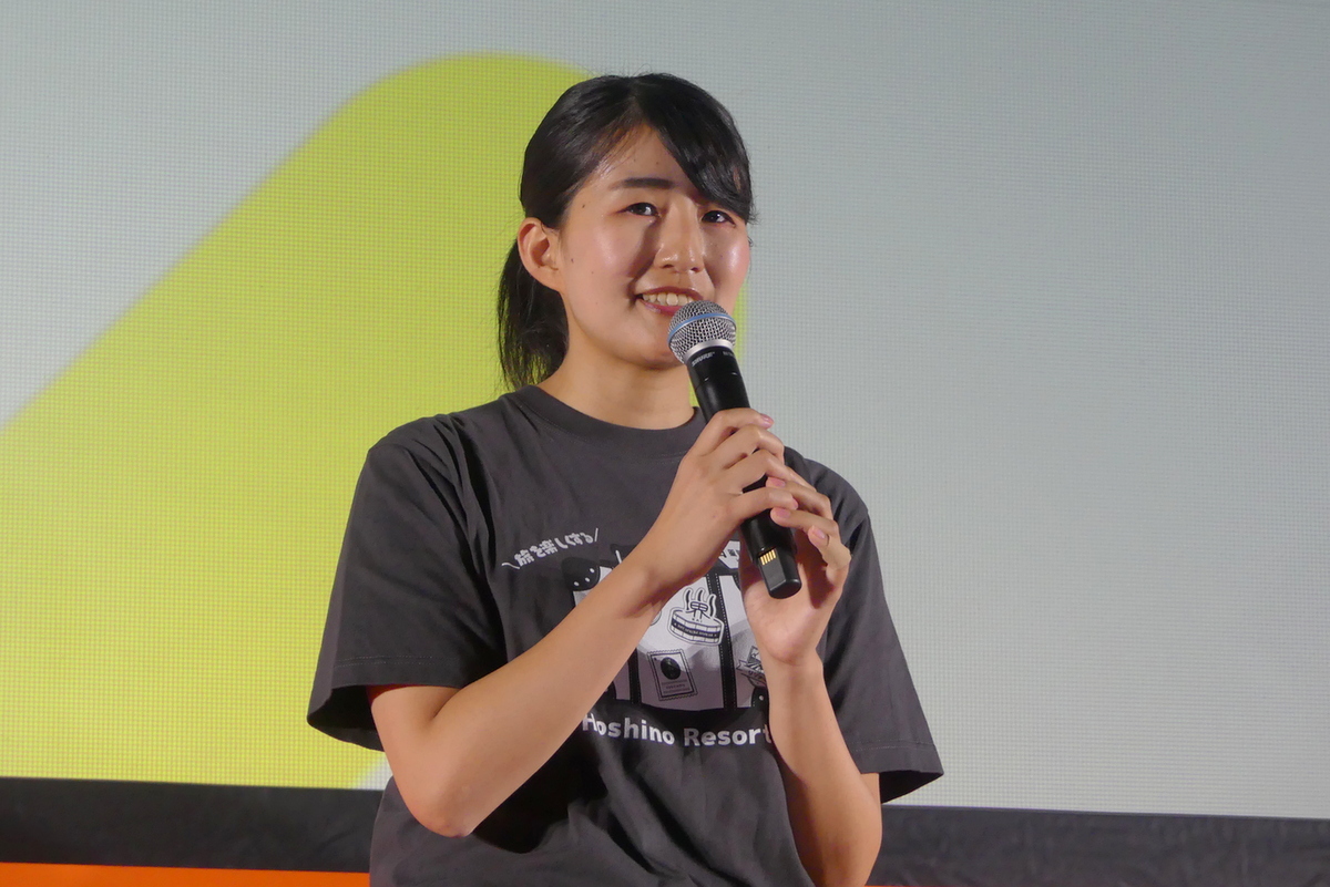 マイクを受け取った星野リゾート 情報システムグループ 情報システムグループ 小竹 潤子氏は、情報システムグループでヘルプデスクと業務改善を担当している。kintoneの認定資格も取得し、エバンジェリストとしても活躍している小竹氏。もともとは新卒で星野リゾートに入り、星のや軽井沢でサービススタッフとして働いていたが、3年目に「もっと業務改善がしたい」という希望を持って情報システムグループへ異動した(関連記事:利用7年目に突入した星野リゾート、愛されるkitnoneのはぐくみ方を語る)。