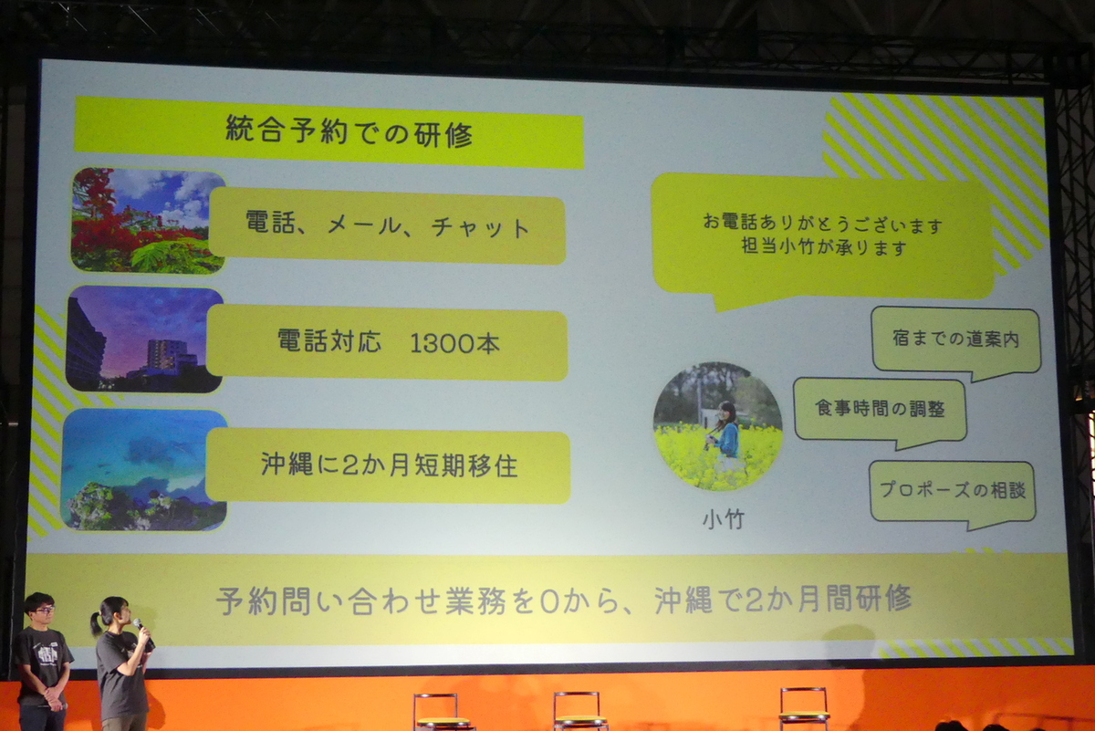 小竹氏は、沖縄に2ヶ月の間、短期移住し、予約問い合わせ業務をゼロの状態から学んだ。単に学んだだけではなく、実際の業務にも携わった。「すごく情報量が多く、4画面のモニターと電話で業務を行なっていた」とのことだ。