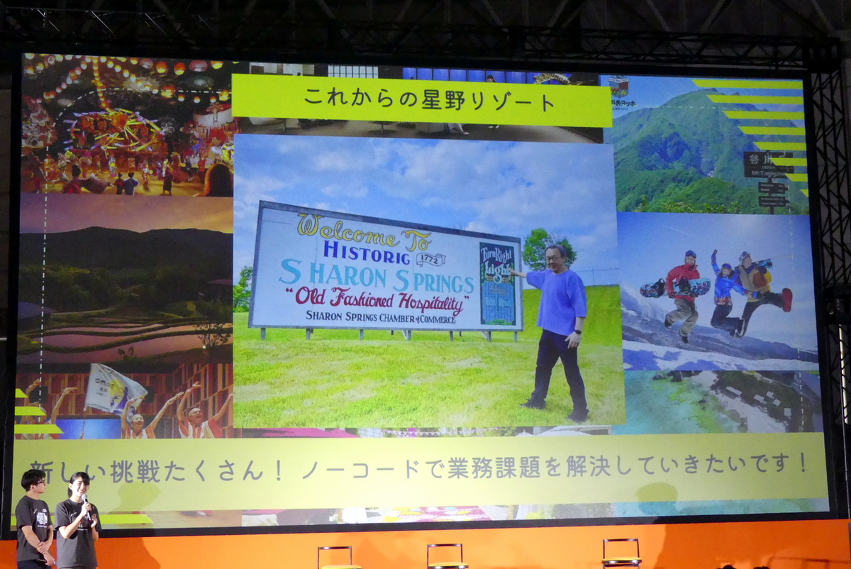 小竹氏は「北米に温泉旅館を作る」と意気込む星野リゾート星野佳路氏の写真を掲げ、「さまざまな業務課題もあり、マーケットもガラッと変わるので、いろんな未知な課題が出てくる。そういった課題に私もワクワクしていますし、ITの力を使って取り組めることが面白いと感じている。新しい課題があっても、ノーコードを使ってどんどん解決できたらいいなと思っています」とまとめた。