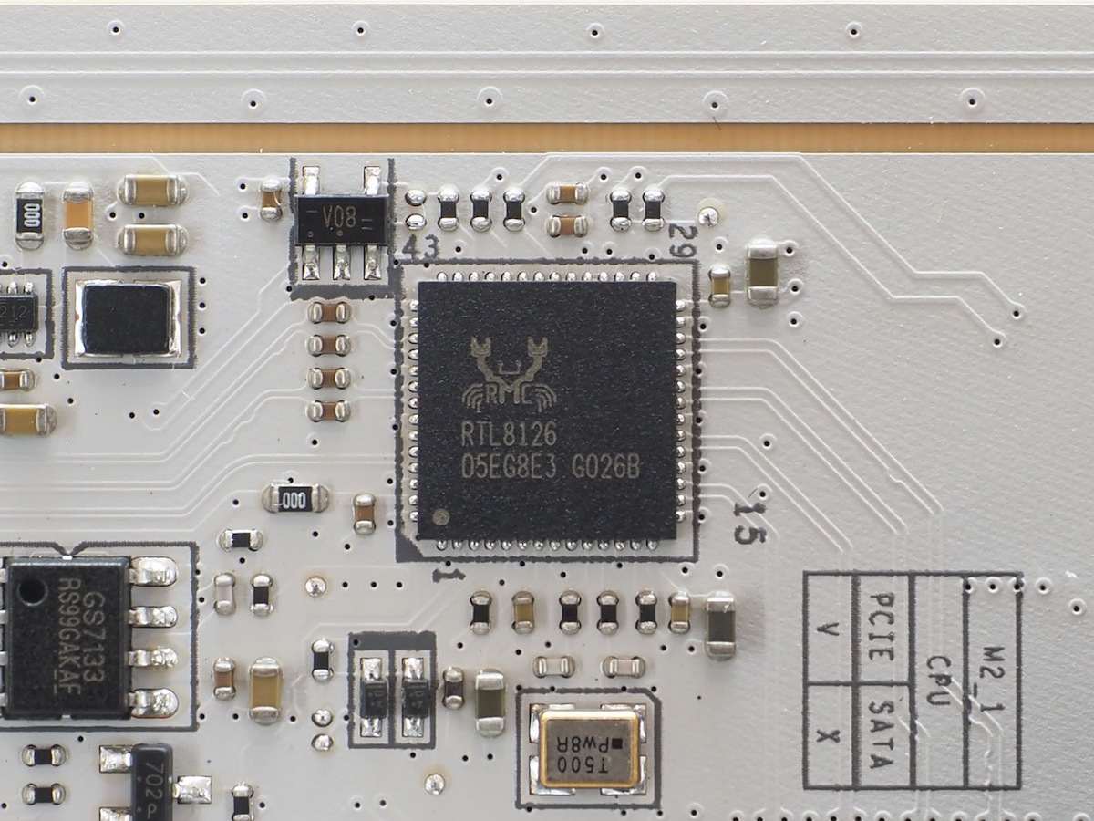 ここからはLANやオーディオチップなどインターフェース面を見ていこう。まずはLAN。5GbE対応のRealtek「RTL8126」を搭載している。最近ようやく普及しはじめた2.5GbEに対し、ひとつ上の5GbEを採用しているところがポイントだ。