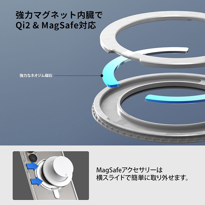 強力マグネット内蔵のリングスタンドにはN54ネオジム磁石を内蔵し、Qi2やMagSafe対応アクセサリーを快適に使用可能。しっかりとした固定力でデバイスを安全に保護します。ケース装着のままスムーズに充電やアクセサリーの脱着ができます。