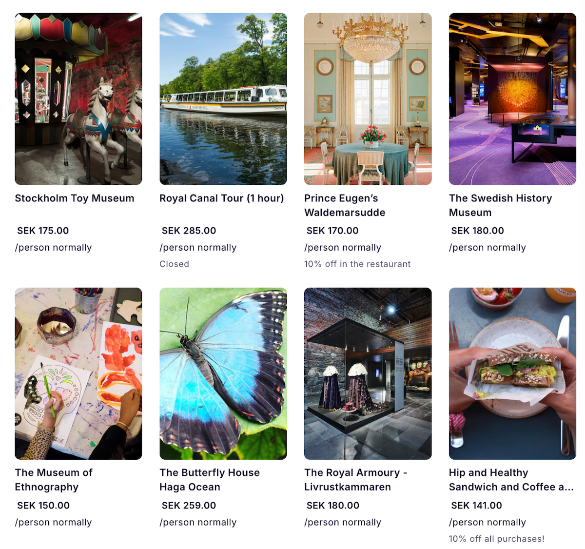 ストックホルムパスの料金は1日券が1009SEK(約1万4330円)ですが、時期や販売サイトによっては割引もしているようで、原稿執筆時はGo Cityというサイトで899SEK(約1万2770円)で購入可能。ストックホルムパスを購入しておけば、例として上げたバイキング博物館(入場料189SEK)が無料に。そのほかボートツアーや食事なども無料になる施設があり、その数は70以上。物価高のストックホルムですが、スケジュールをしっかり立ててストックホルムパスを活用すれば、かなりお得に街中を観光できそうです。